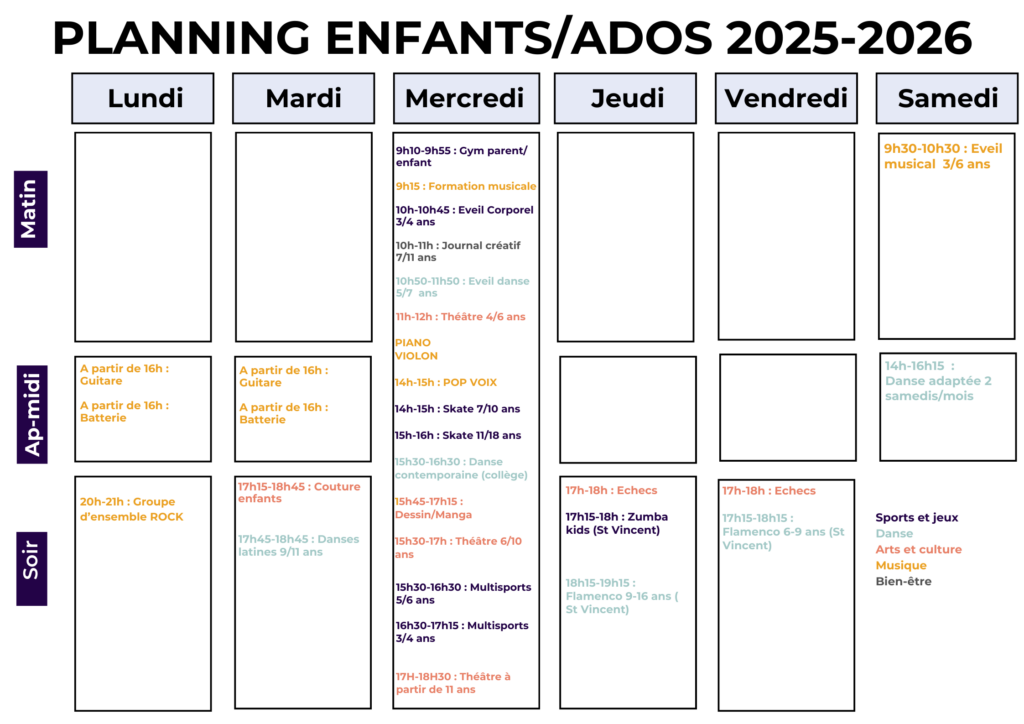 Un professeur ou un animateur prestataire absent rattrapera son cours aux heures et créneaux qu’il lui sera possible de réserver. Les adhérents seront prévenus par mail ou par téléphone de ces changements. En cas d’absence de plus de 3 semaines d’un animateur, il sera proposé un avoir ou un remboursement. Si un adhérent est absent à son cours qui n’a lieu qu’une fois par semaine, ce dernier ne sera pas remplacé. Les tarifs sont calculés après déduction des vacances scolaires.