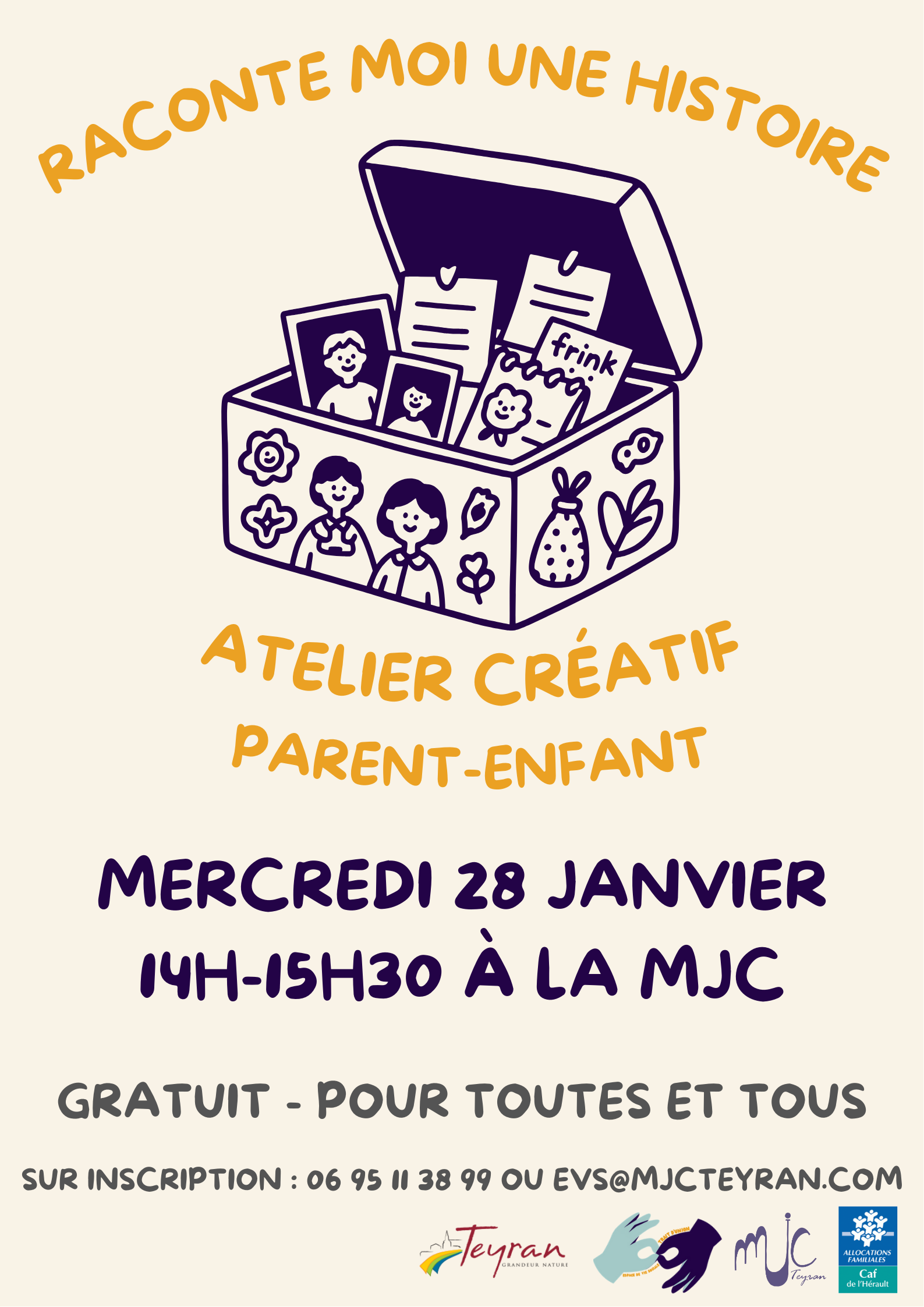 “Raconte moi une histoire” c’est un atelier de Journal Créatif® parents-enfants pour offrir un temps pour explorer les émotions en famille sur le thème d'un moment de joie partagé. C'est un espace bienveillant, doux et créatif pour partager un souvenir réconfortant d'un moment vécu ensemble. Places limitées à 6 binômes. Pour les enfants de … Mercredi 28 janvier 2026, 14h-15h30 à la MJC : Raconte-moi une histoire Lire la suite » |