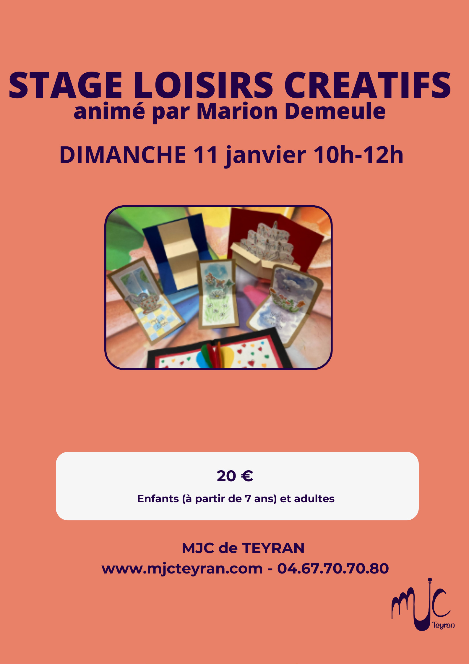 Envie de créer quelque chose de beau, de surprenant et de fait main ? Rejoignez-nous pour un atelier ludique et accessible à tous : de 7 à 77 ans (et plus!). Pendant 2 heures, nous apprendrons à réaliser des cartes pop-up, ces cartes qui s’ouvrent… et cachent une surprise en 3D ! Pas besoin d’être … Dimanche 11 janvier : Atelier Loisirs créatifs de 10h à 12h avec Marion DEMEULE Lire la suite » |