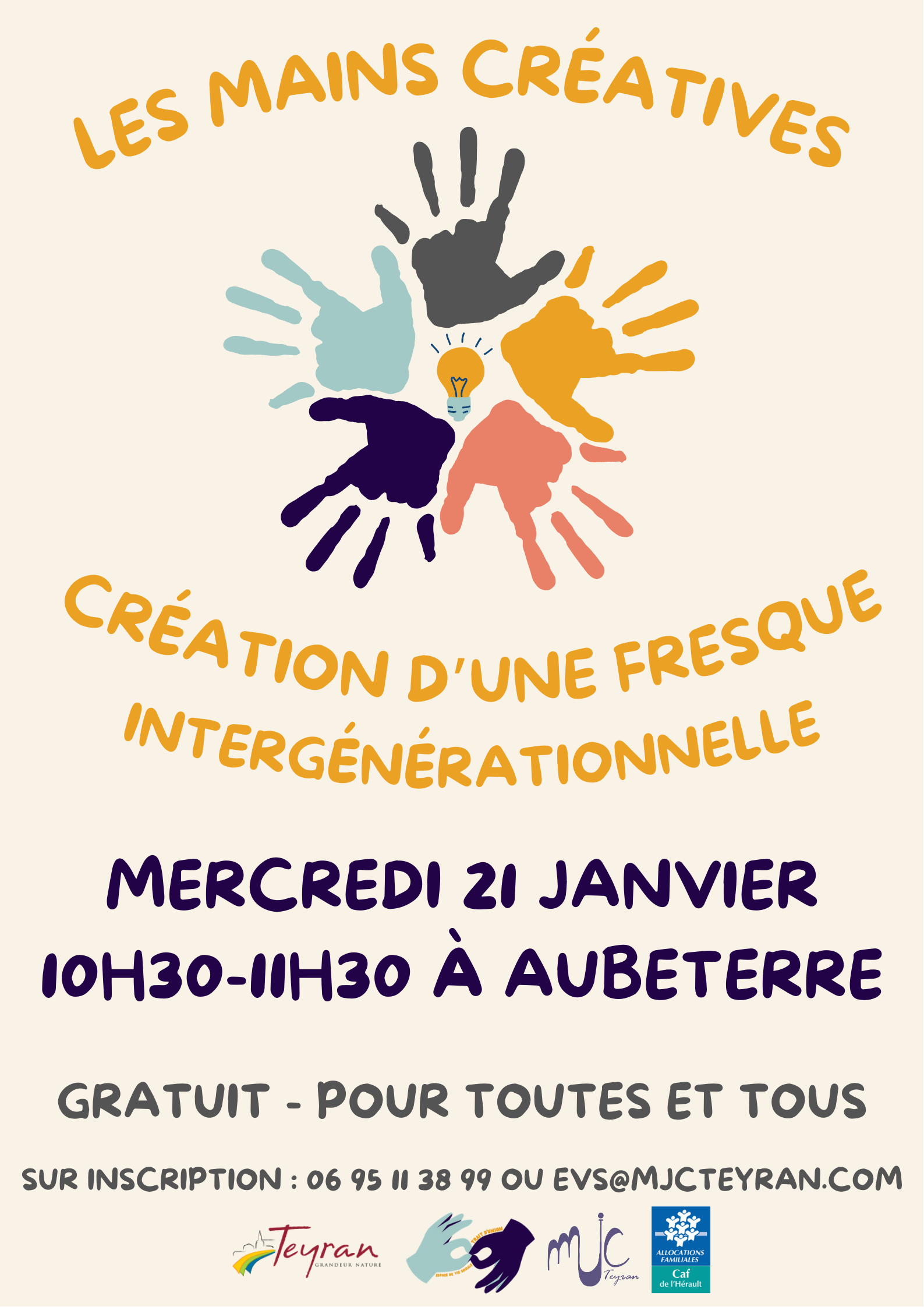 Les mains créatives c’est un temps organisé une fois par mois où toutes les mains se mêlent pour faire ensemble autour d’un atelier créatif ! Cette fois-ci, dans un esprit de rencontre intergénérationnelle, nous nous retrouvons à l’EHPAD d’Aubeterre pour créer ensemble une fresque collective pour la nouvelle année. Infos et inscriptions auprès de Clémentine … |