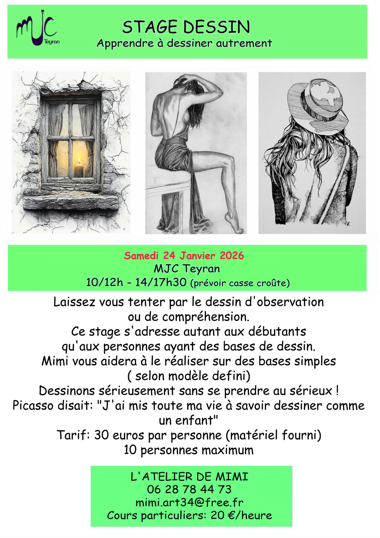 Laissez-vous tenter par le dessin d’observation ou de compréhension. Ce stage s’adresse autant aux débutants qu’aux personnes ayant des bases de dessin. Mimi vous aidera à le réaliser sur des bases simples. Dessinons sérieusement sans se prendre au sérieux ! De 10h à 12h - 14h à 17h30 ( prévoir casse croûte) Tarif : … |