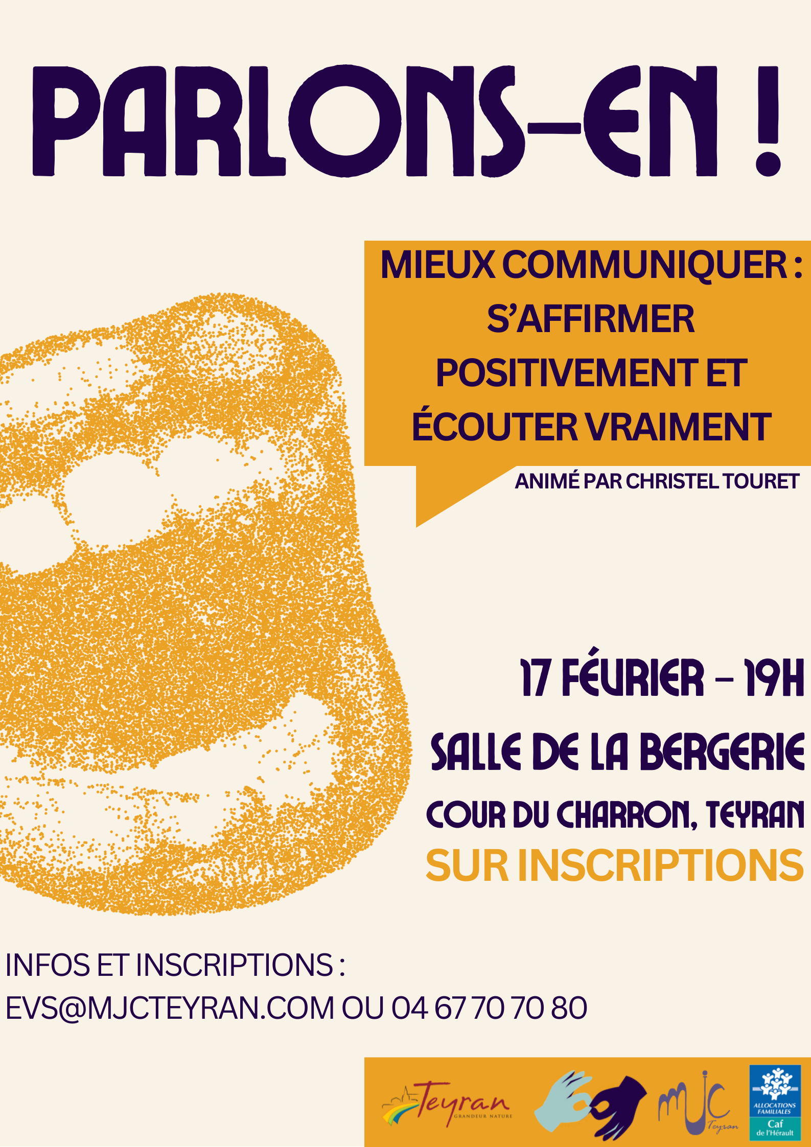 Mieux communiquer : s’affirmer positivement et écouter vraiment Qui n’a jamais connu un conflit dû à un problème de communication ? Qu’est-ce qui entrave une bonne communication ? Et, à l’inverse, qu’est-ce qui la rend possible ? Comment préserver la relation, même dans le désaccord, que ce soit avec nos proches ou nos collègues ? … Mardi 17 février : Parlons-en ! : Comment écouter ? 19h à la Salle de la Bergerie Lire la suite » |