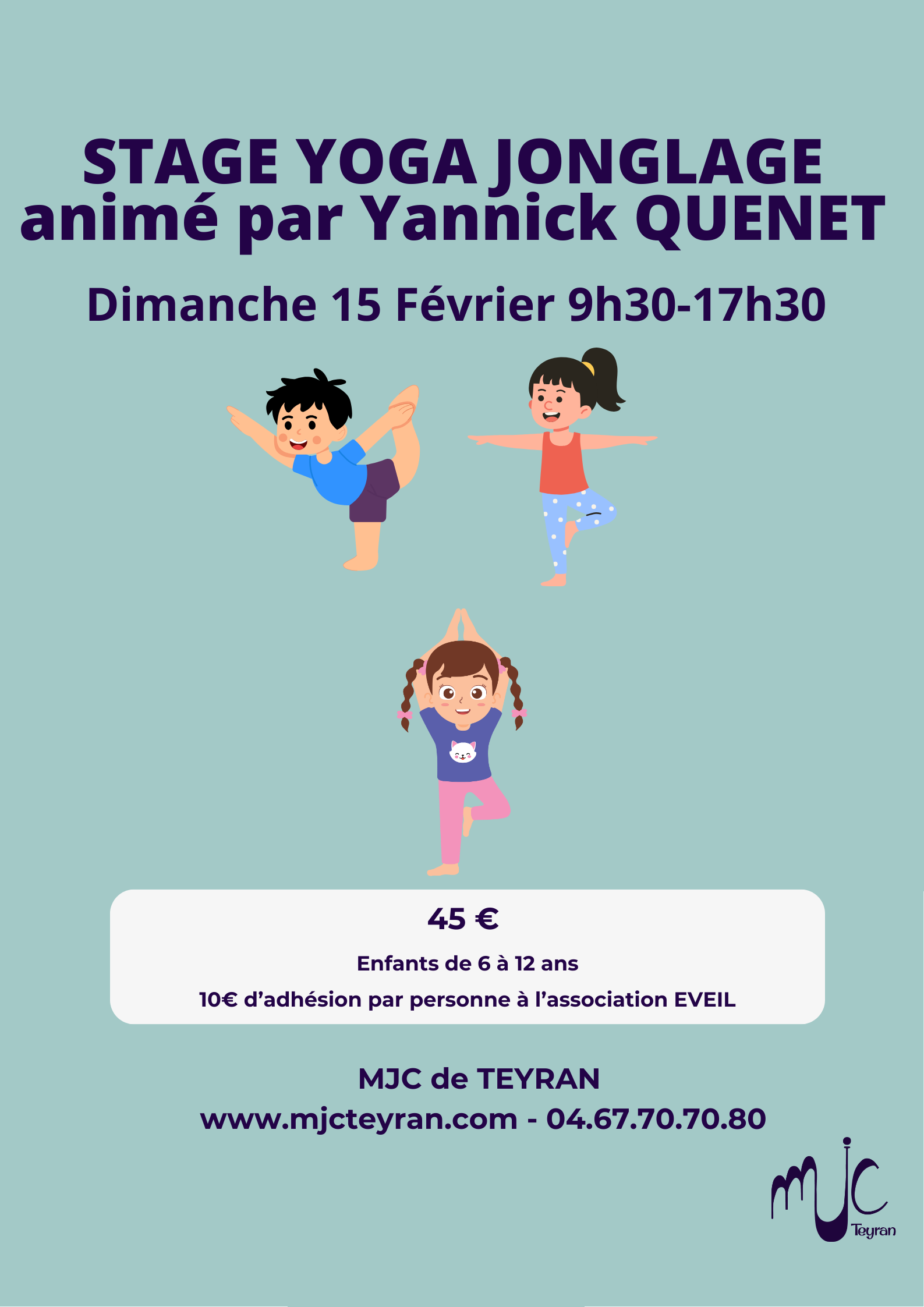 Par le yoga sous forme ludique, le massage, le jonglage, le jeu, et différentes formes de créativité, permettre l’éveil et le développement physique et mental de l’enfant. De 6 à 12 ans 9h30 - 17h30 à la MJC 45€/ jour /enfant 10€ d’adhésion par personne à l’association EVEIL Repas tiré du sac Inscriptions avec Yannick … Dimanche 15 février : Atelier Yoga Enfants de 9h30 à 17h30 Lire la suite » |
