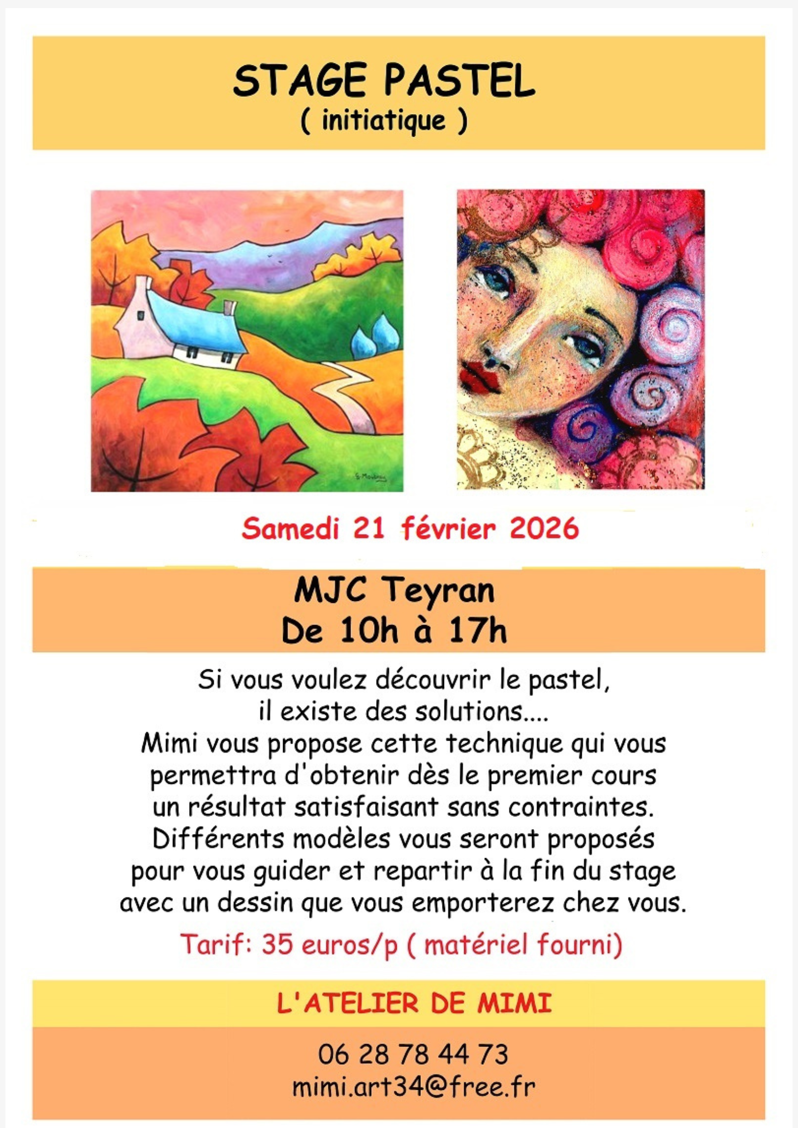 De 10h à 12h - 14h à 17h30 ( prévoir casse croûte) Tarif : 35 euros par personne (matériel fourni) Inscription obligatoire Initiation et pratique du pastel : couleurs, dégradés et lumière. Accessible à tous, dans une ambiance créative et conviviale. Inscription au 04 67 70 70 80 ou à accueil@mjcteyran.com |